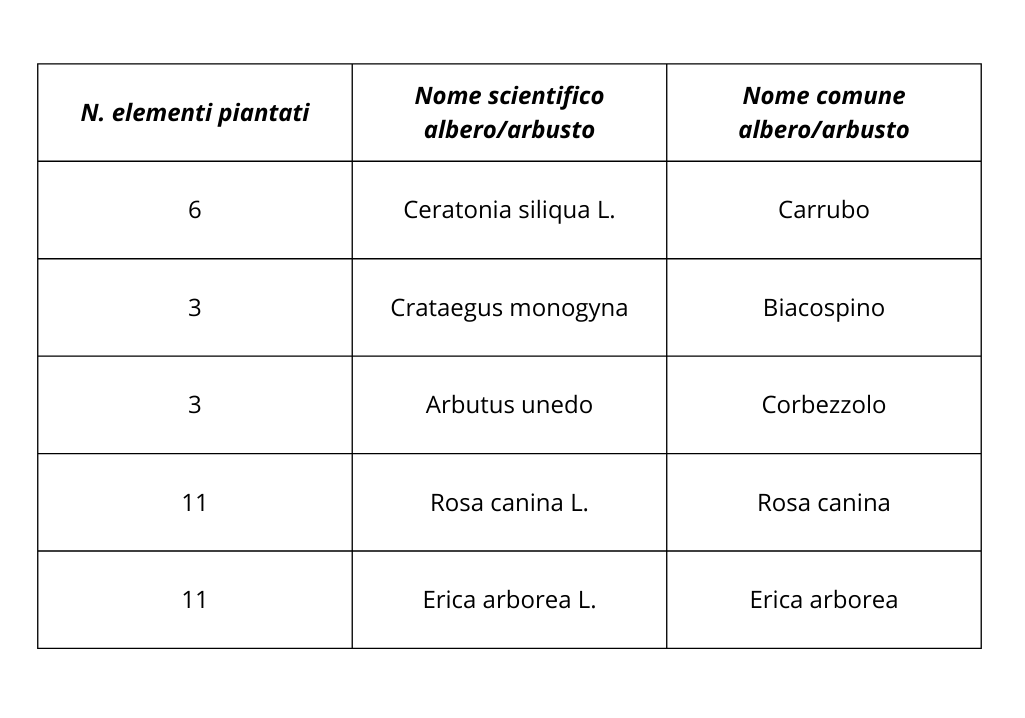 Il progetto ha previsto la rimozione di tamerici secche e la messa in dimora di alberi ed arbusti conformi alle normative regionali, nello specifico: